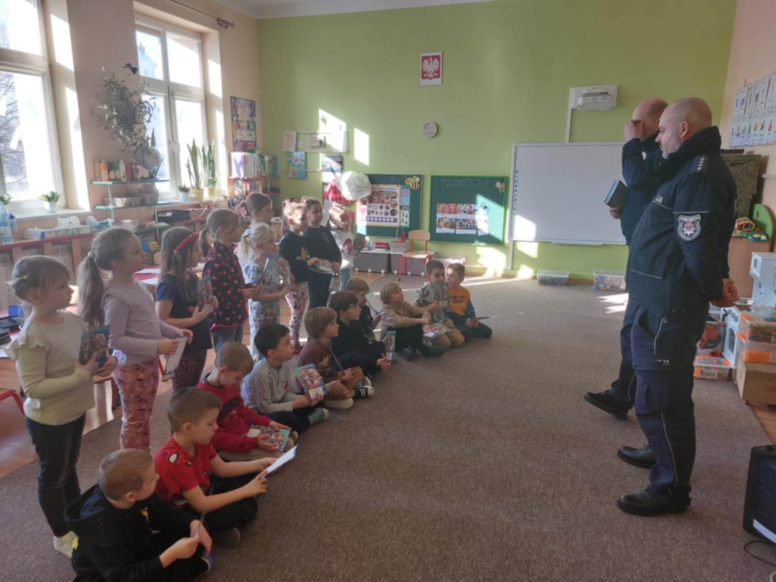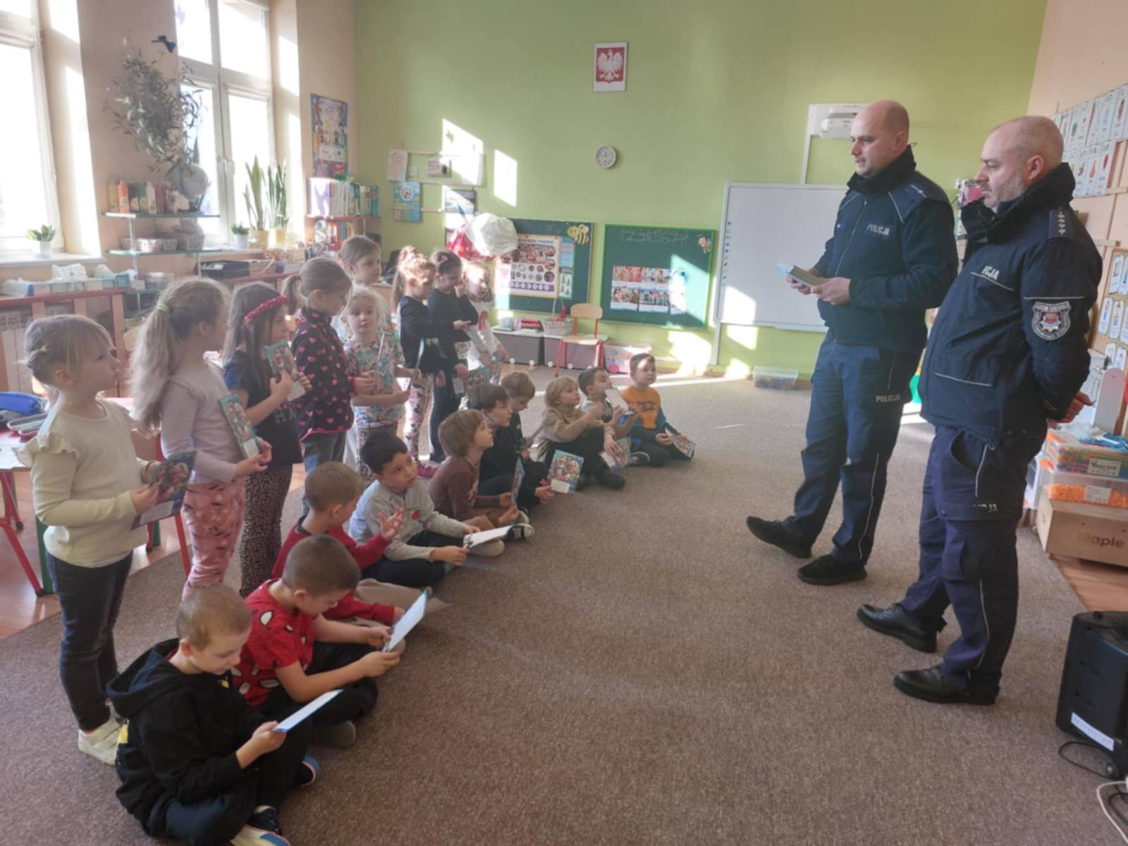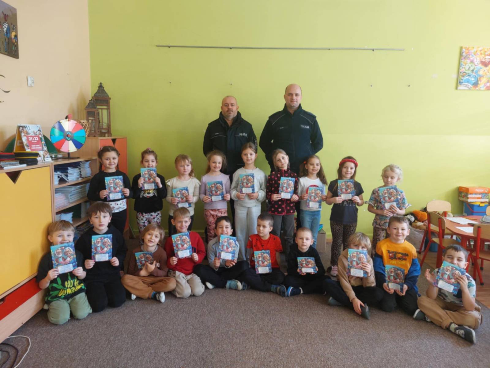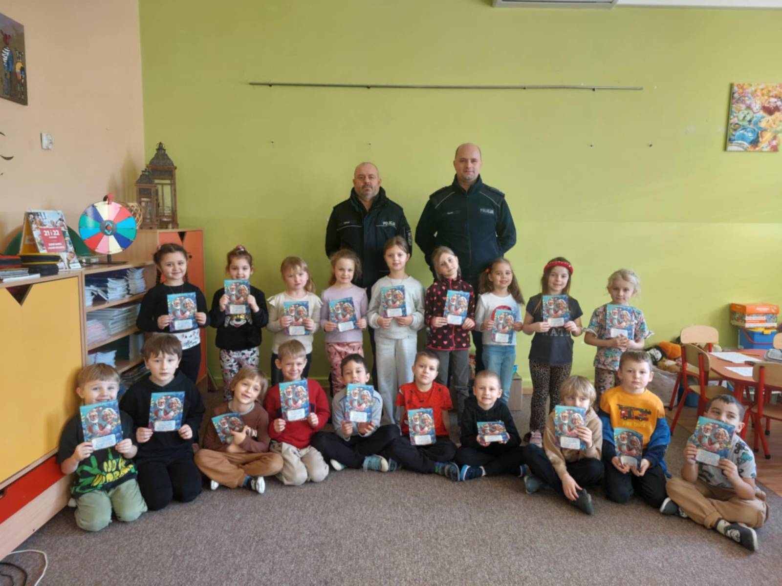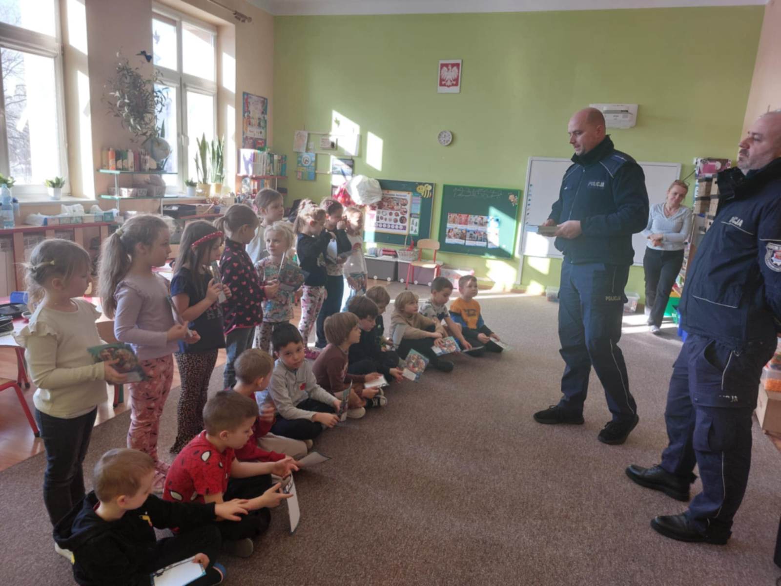 W dniu dzisiejszym nasze przedszkole odwiedzili policjanci, którzy przeprowadzili krótką prelekcję dla starszaków. Tematem spotkania były zbliżające się ferie zimowe oraz przypomnienie najważniejszych zasad bezpieczeństwa podczas zimowego wypoczynku. Policjanci rozmawiali z dziećmi m.in. o tym, dlaczego nie wolno wchodzić na zamarznięte zbiorniki wodne, jak bezpiecznie bawić się na śniegu oraz kiedy i dlaczego należy nosić kask podczas uprawiania sportów zimowych, takich jak jazda na sankach czy łyżwach. Przedszkolaki dowiedziały się również, jak ważne jest noszenie elementów odblaskowych, ostrożność podczas zabaw na świeżym powietrzu oraz słuchanie poleceń dorosłych.